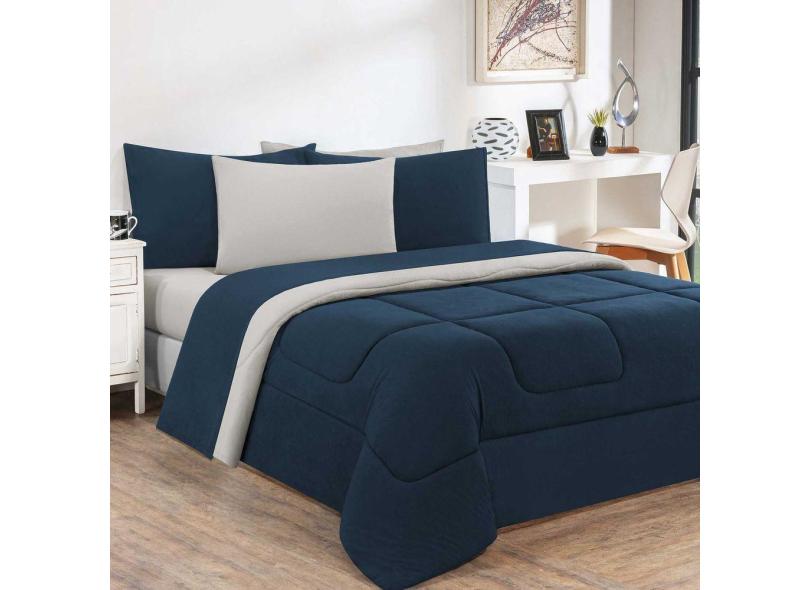 Kit Edredom + Jogo De Lençol Malha 100% Algodão Gran Moratta 6 Peças Casal - Azul Marinho-palha
