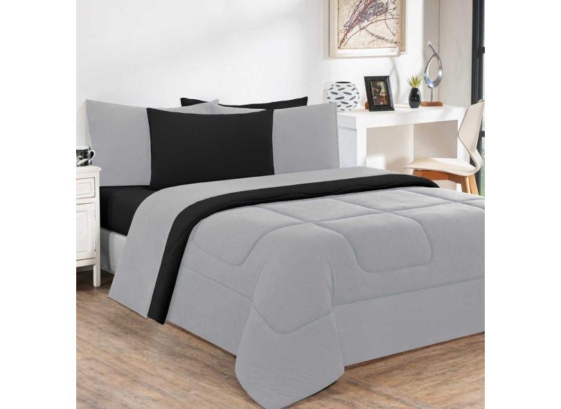 Kit Edredom + Jogo De Lençol Malha 100% Algodão Gran Moratta 6 Peças Casal- Cinza-preto