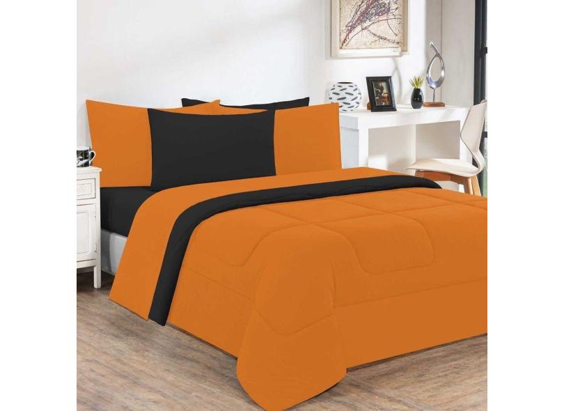 Kit Edredom + Jogo De Lençol Malha 100% Algodão Gran Moratta 6 Peças Casal - Laranja -preto