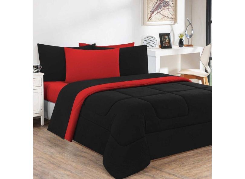 Kit Edredom + Jogo De Lençol Malha 100% Algodão Gran Moratta 6 Peças Casal - Preto-vermelho