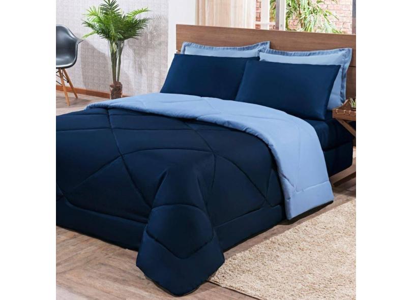 Kit EdredomJogo De Lençol Aconchego Look House Dupla Face Casal King 06 Peças - Azul Marinho E Azul