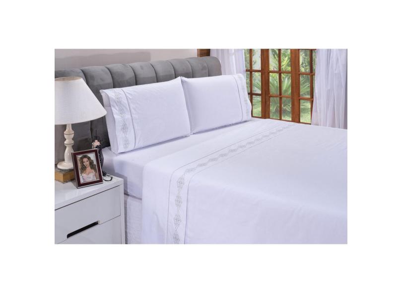 Lençol 100% Algodão Casal Queen Bordado Diamante Branco e Cinza 4pçs