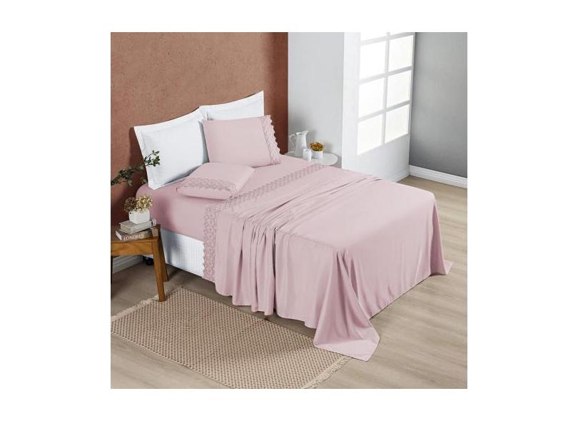 Lençol Casal Queen Bordado Inglês 200 Fios 04 Pçs Rosa - Jm Enxovais