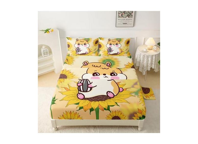 QOOMO Jogo de cama kawaii, hamster, girassol, animais fofos, supermacio, 1 lençol com elástico, 1 lençol de cima, 2 fronhas, respirável, para decoração de quarto