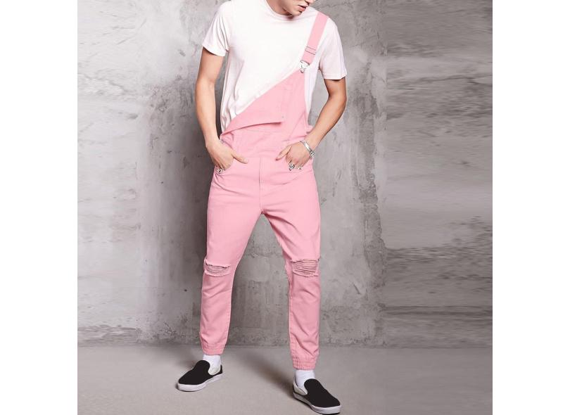 Macacão masculino Hole Pocket Jeans Macacão Streetwear Calça suspensora de macacão