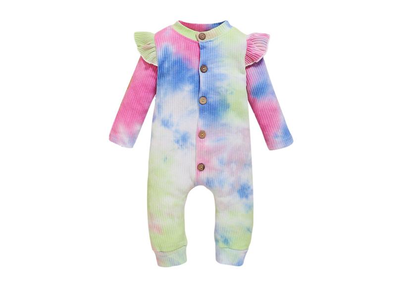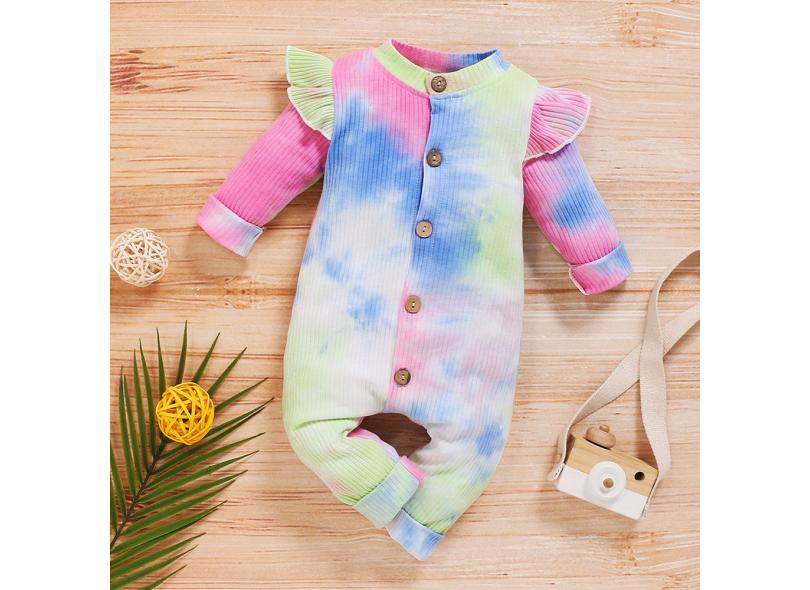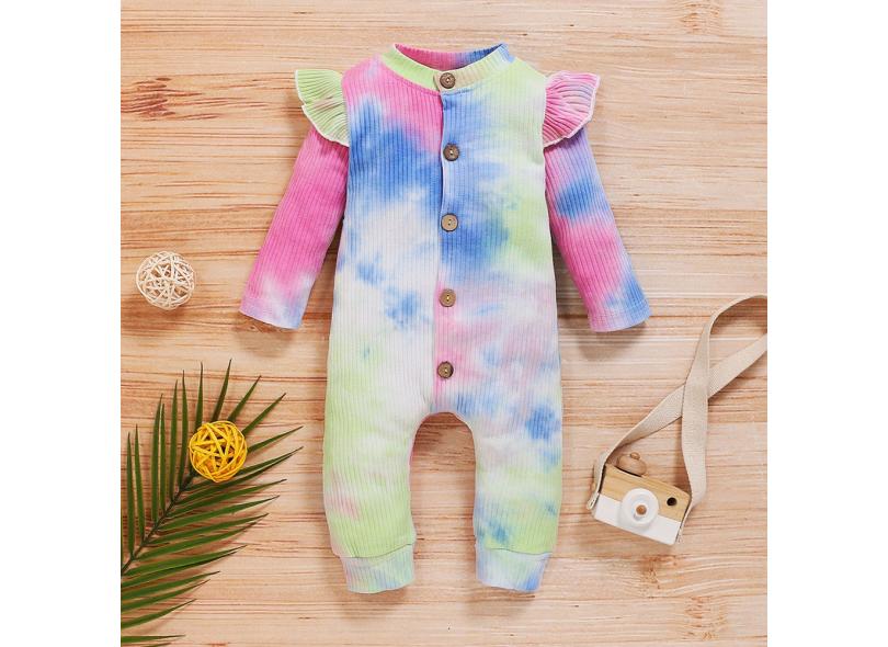 Macacão para bebês e meninas de manga comprida arco-íris tingido com babados macacão -cool
