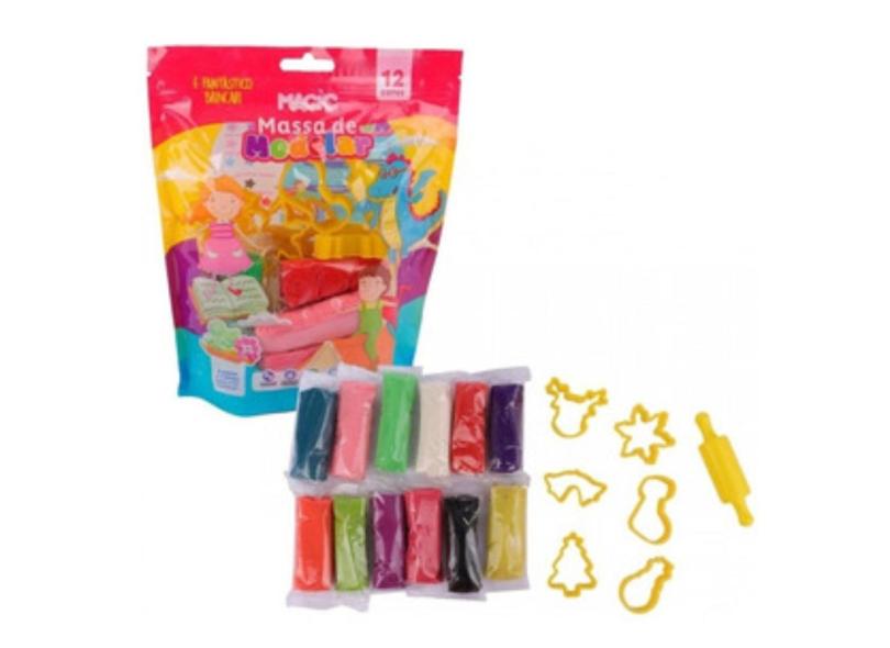 Massinhas de Modelar 19 Peças e 12 Cores com Moldes e Rolinho Pula e Molda Pacote