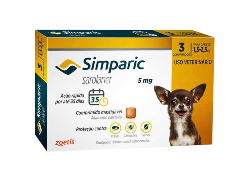 Antipulgas Simparic 5 mg para cães 1,3 a 2,5 kg - Zoetis Cx c/ 3 comprimidos