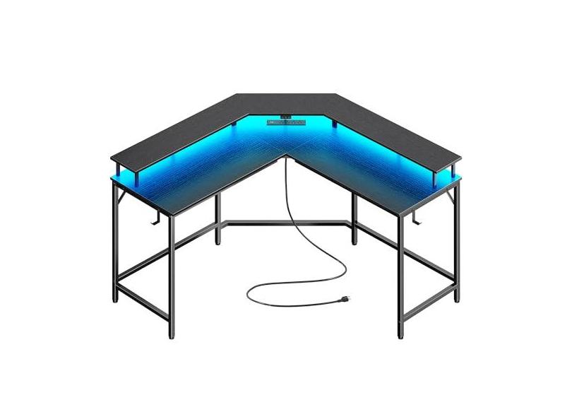 Huuger Mesa de jogos em forma de L com tomadas elétricas e luzes LED, mesa de computador com prateleiras de monitor, superfície de fibra de carbono, mesa de escritório em casa, mesa de canto para