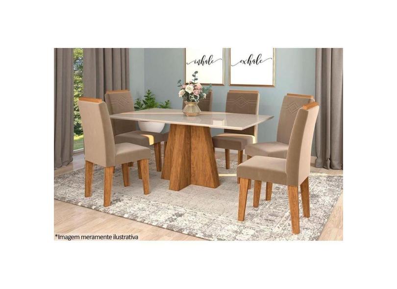 Mesa Cozinha Patricia c/ Tampo Madeirado c/ Vidro Canto Reto 160x80cm e 6 Cadeiras Taís Savana-Nature-Madeirado/Off White -Velud-Cimol