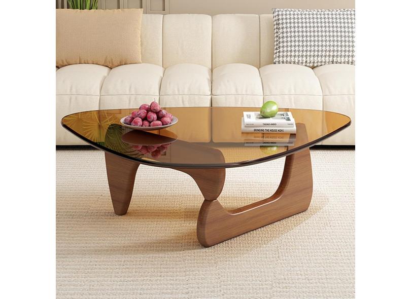 Mesa de centro de vidro triangular, mesa final de vidro preto vintage, mesa final moderna com base de madeira maciça para sala de estar, pátio, escritório, pernas de nogueira + a, 114 × 82 ×