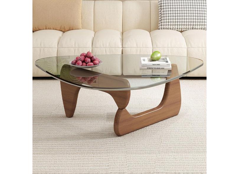 Mesa de centro de vidro triangular, mesa final de vidro preto vintage, mesa final moderna com base de madeira maciça para sala de estar, pátio, escritório, pernas de nogueira + c, 91 × 65 ×
