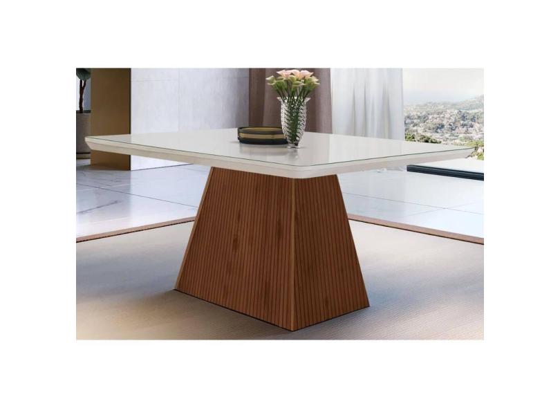 Mesa de Sala Jantar Luna c/ Tampo 120x80cm Madeirado Vidro Canto Curvo - Imbuia/Ripado 3D/Off White - Rufato