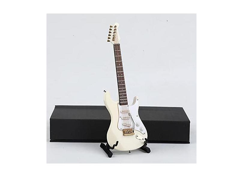 Dselvgvu Guitarra elétrica em miniatura de madeira com suporte e estojo, réplica de mini instrumento musical, acessórios para casa de bonecas, modelo de enfeite de Natal, presente de aniversário