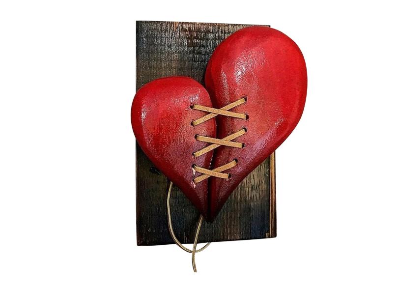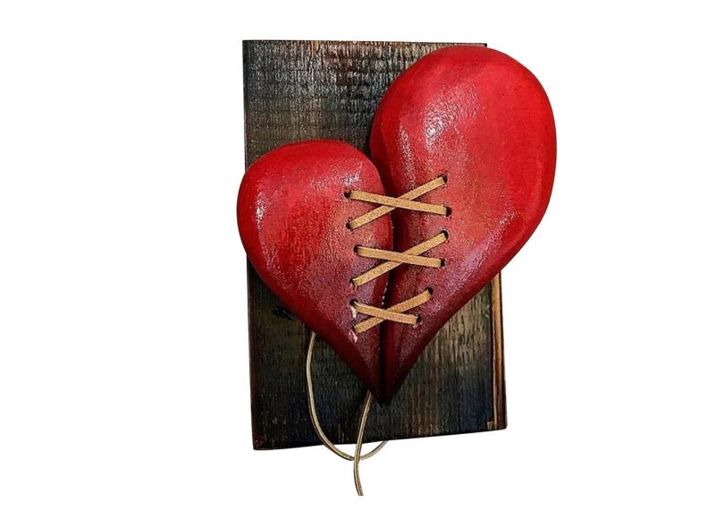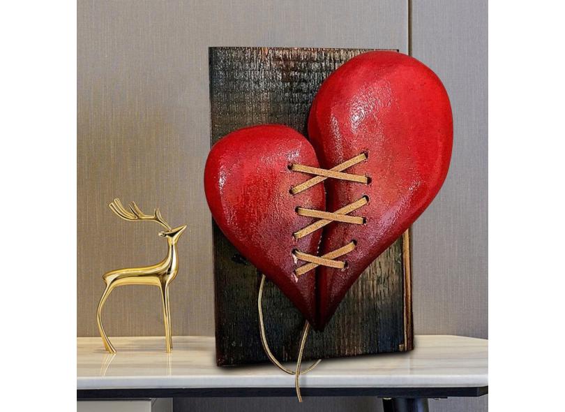 Decoração de estátua de madeira quebrada Coração Couro Costurado Escultura de madeira Decoração de parede Enfeites, Escultura de arte decorativa de