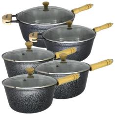 Jogo Panelas Alumínio Craqueado Cabo de Madeira Tampa Vidro
