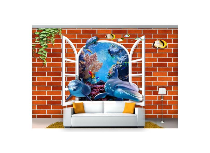 Papel De Parede Golfinhos Janela Vida Mar 3D Fm105