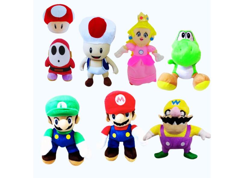 O menor preço encontrado no Brasil para 08 Pelúcias Mario Luigi Wario Princesa Toady Yoshi Cogumelo atualmente é R$ 284,40.
