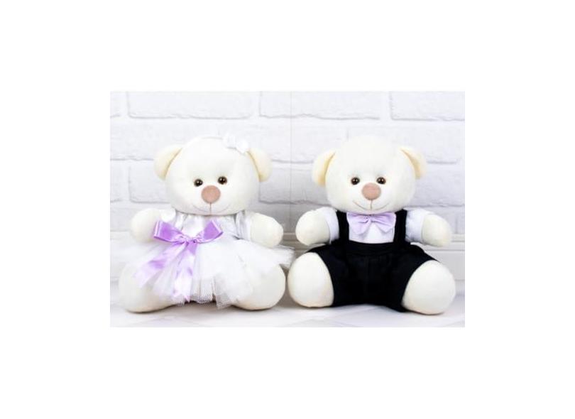 Casal Ursos Tedde Pajem Preto, Daminha Branca - Pelúcia Palha 18 cm (Pajem Preto, Daminha Branca, detalhes lilás - Pelúcia Palha)