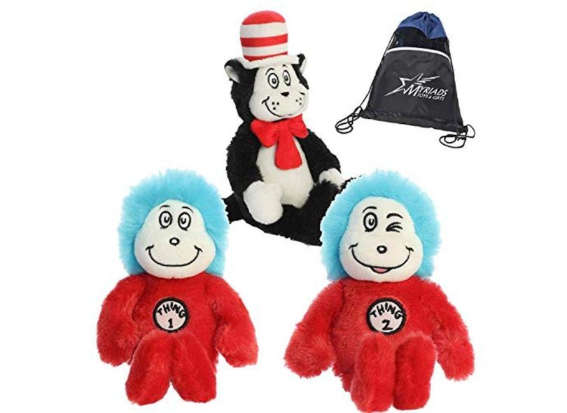 O menor preço encontrado no Brasil para Conjunto de pelúcia Dr. Seuss: chapéu de gato de 20 cm, Thing 1 e 2 de 18 cm, bolsa com cordão atualmente é R$ 585,65.