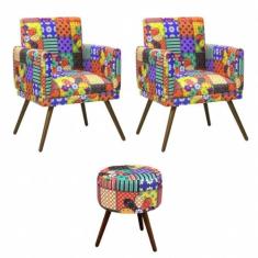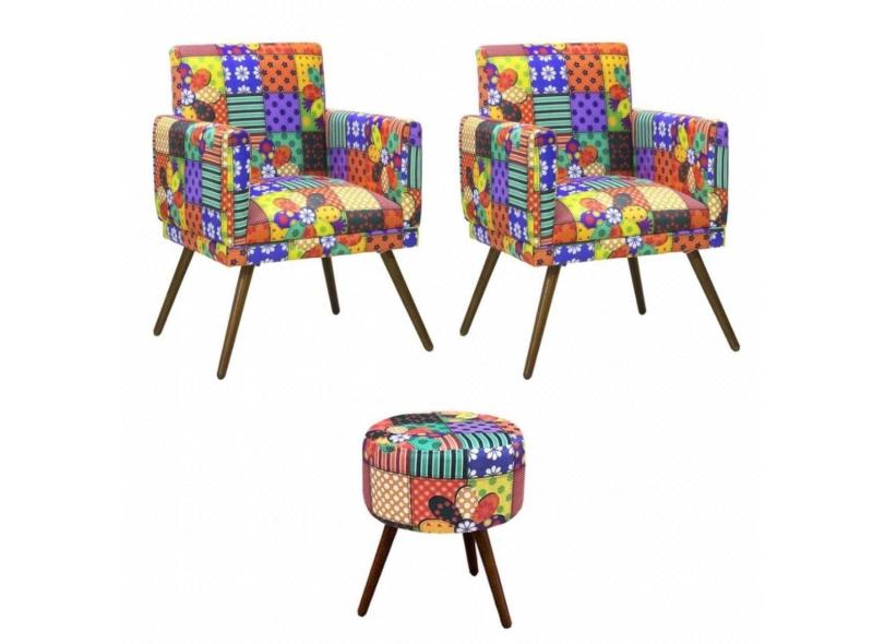 Kit 02 Poltrona Decorativa Nina Com Rodapé E Puff Patchwork