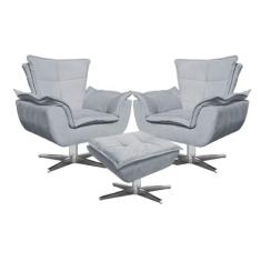 Kit 2 Poltronas Decorativas Base Giratória Cromada com Puff Opla Suede