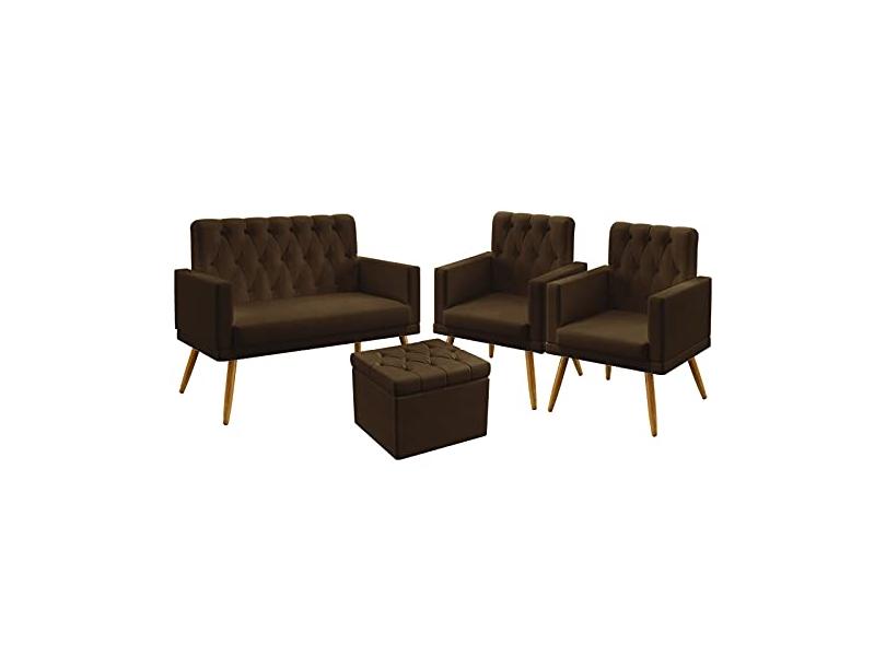 O menor preço encontrado no Brasil para Kit Poltrona Namoradeira e 2 Poltronas Decorativas Estofada Vega Rodapé Capitonê Puff Quasar Botões Sued Marrom Aradecor atualmente é R$ 1.107,83.