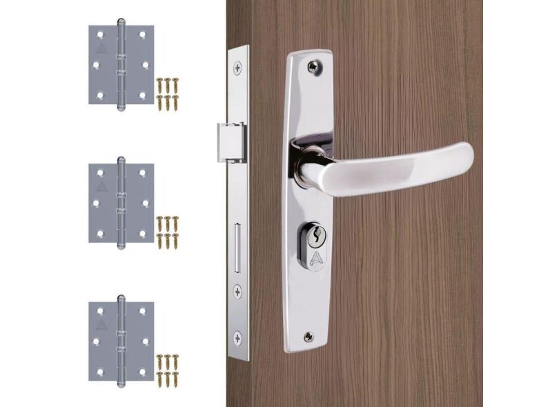 Fechadura Para Porta Externa Aço Inox Cromado + Dobradiças