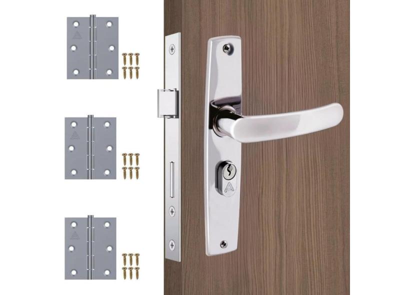 Fechadura Porta Externa Aço Inox Polido Cromado + Dobradiças