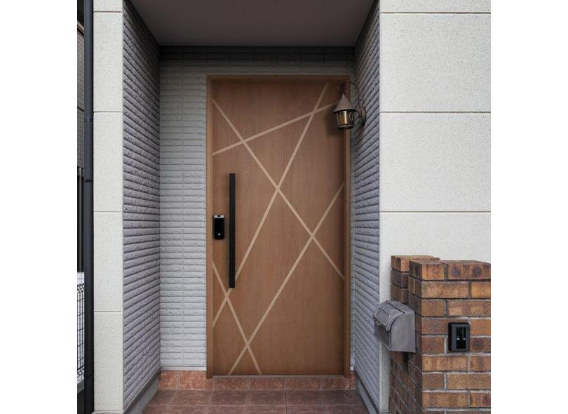 Kit Porta de Madeira Frisada 210x92cm Batente 14cm Fechadura Digital e Puxador