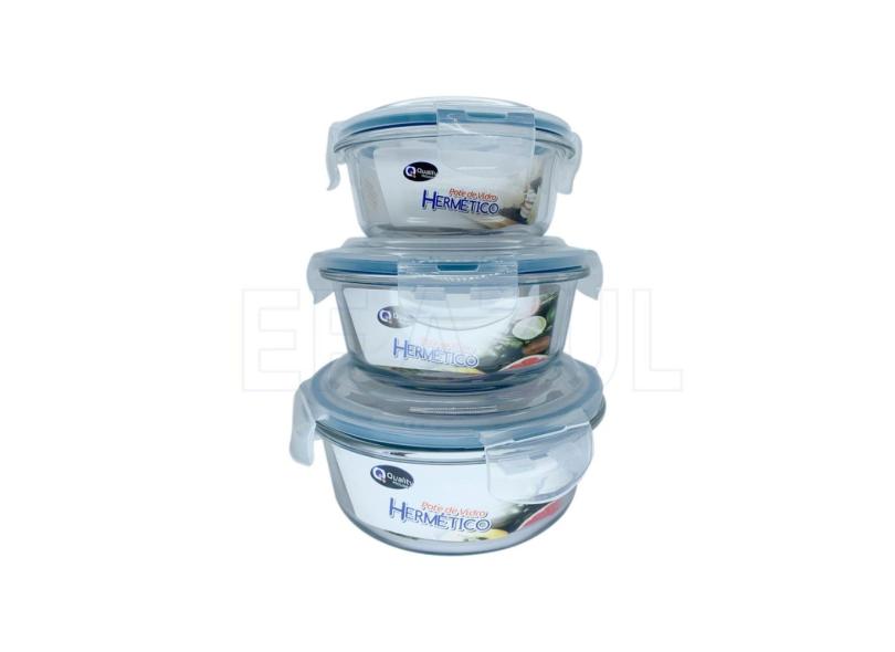 Kit 3 Potes Vidro Redondo Tampa Hermética MARMITA / PAPINHA