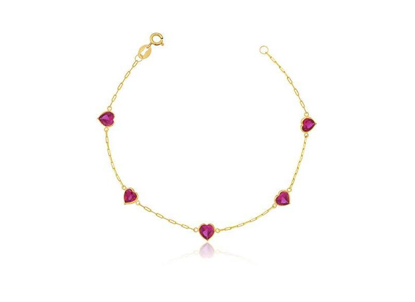 Pulseira Feminina Em Ouro 18k Pedras Coração De Zircônia 5mm Vermelho Rubi