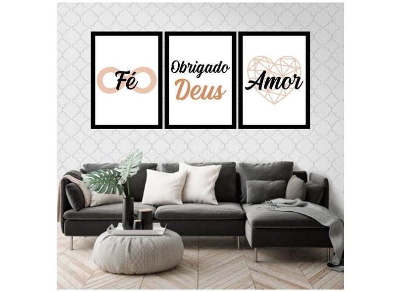 Kit 3 Quadros Decorativos Fé, Obrigado Deus - Marrom 45x34cm