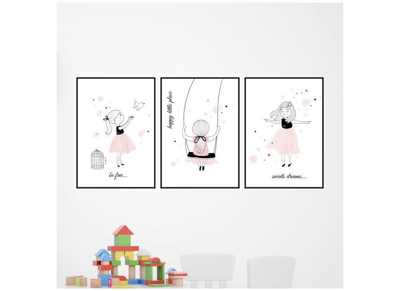 Kit 3 Quadros Decorativos Menina, Balanço e Pássaro 45x34cm