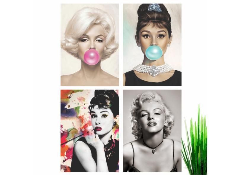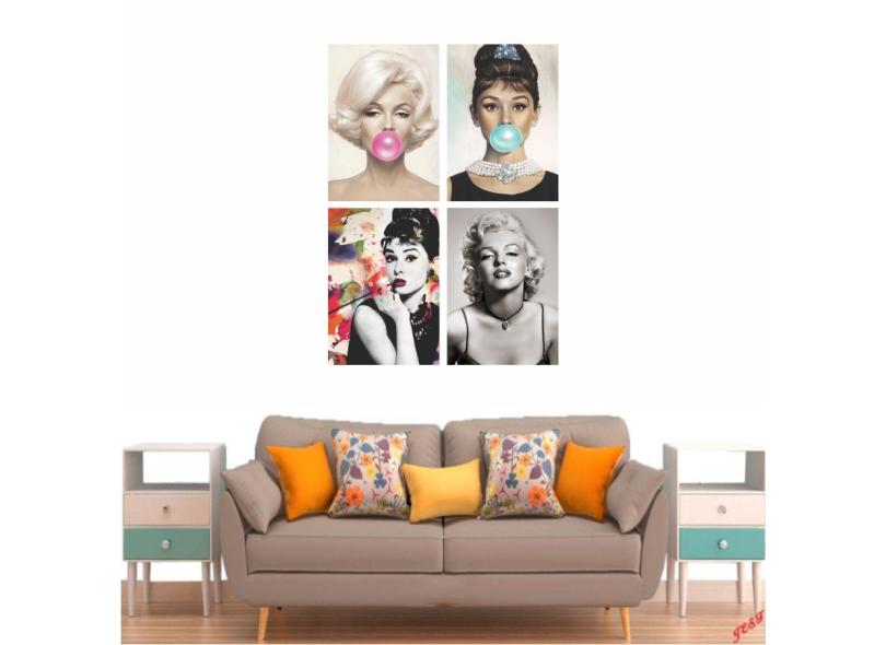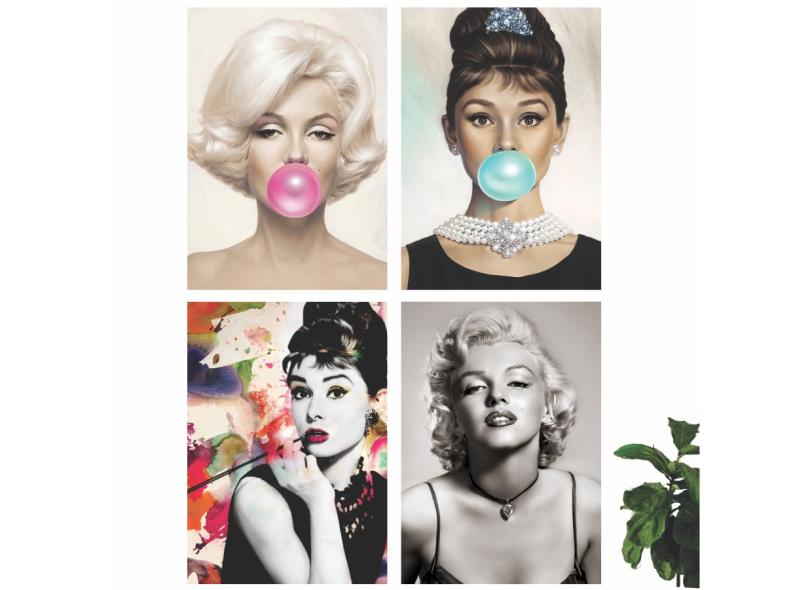Kit 4 Quadros Decor Audrey Marilyn Chiclete 30x22cm