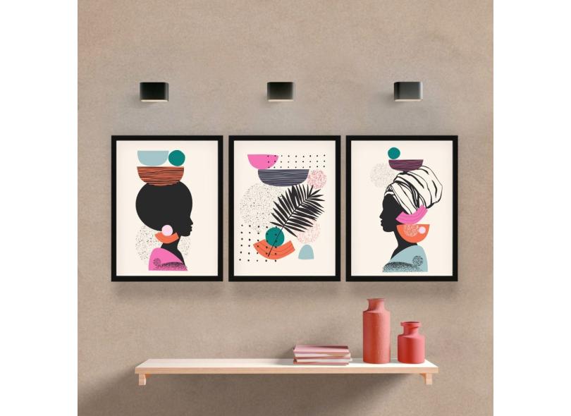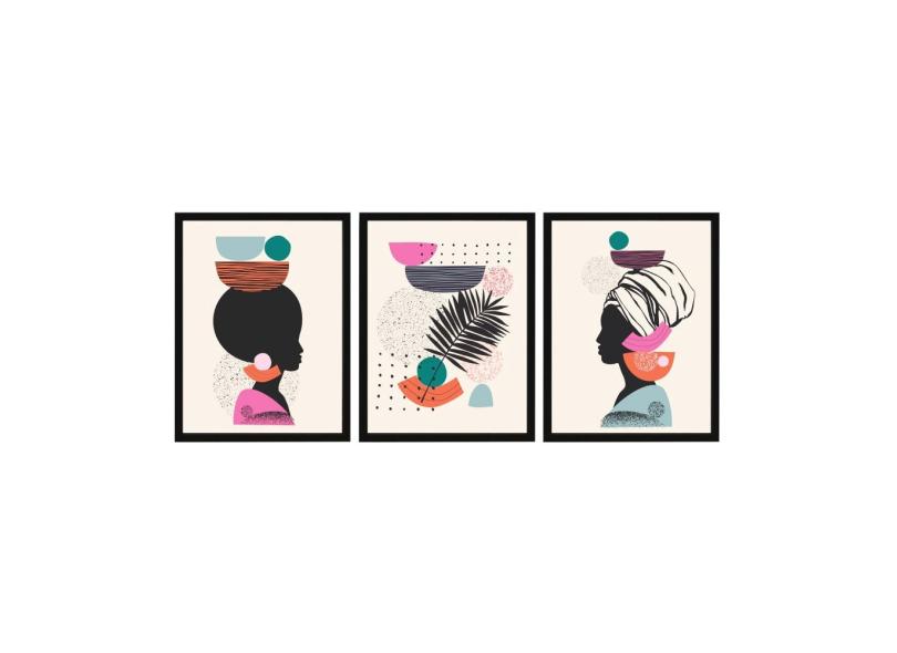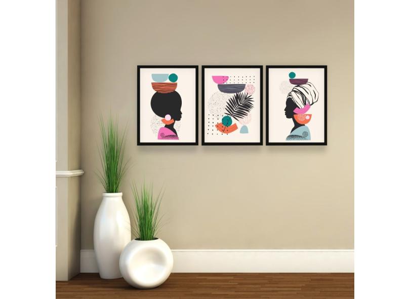 KIT Quadro Decorativo Moldura Mulher Africana Folha 3 peças