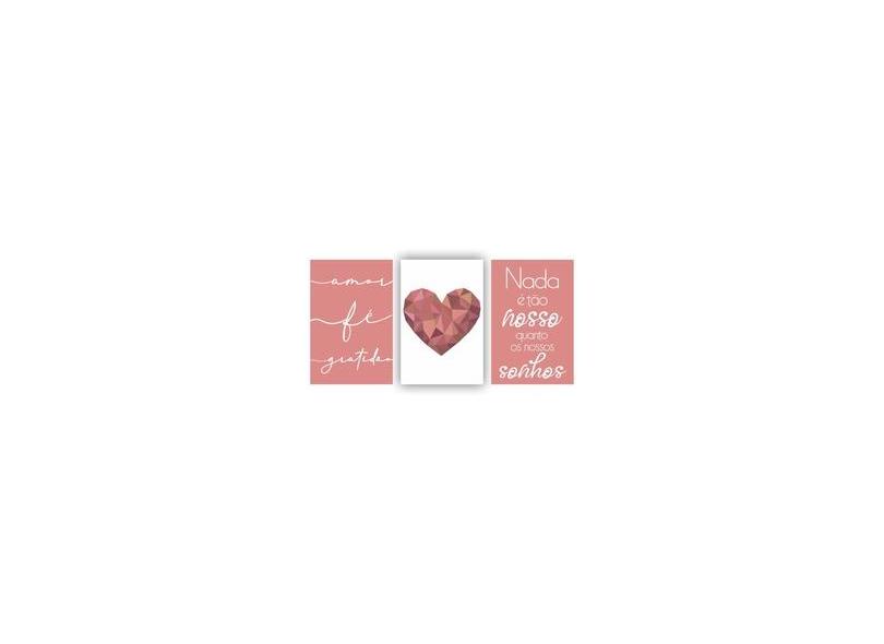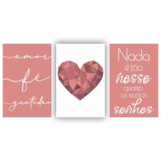 Kit Quadros Decorativos Sala 3Peças 60X40 Coração Rose
