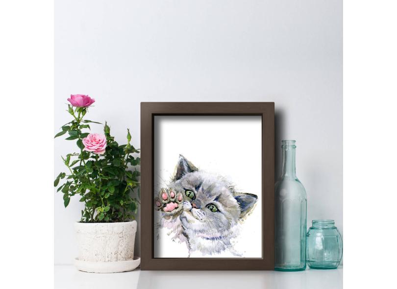 Quadro Quarto Sala Gato Aquarela 22x32cm Moldura Marrom