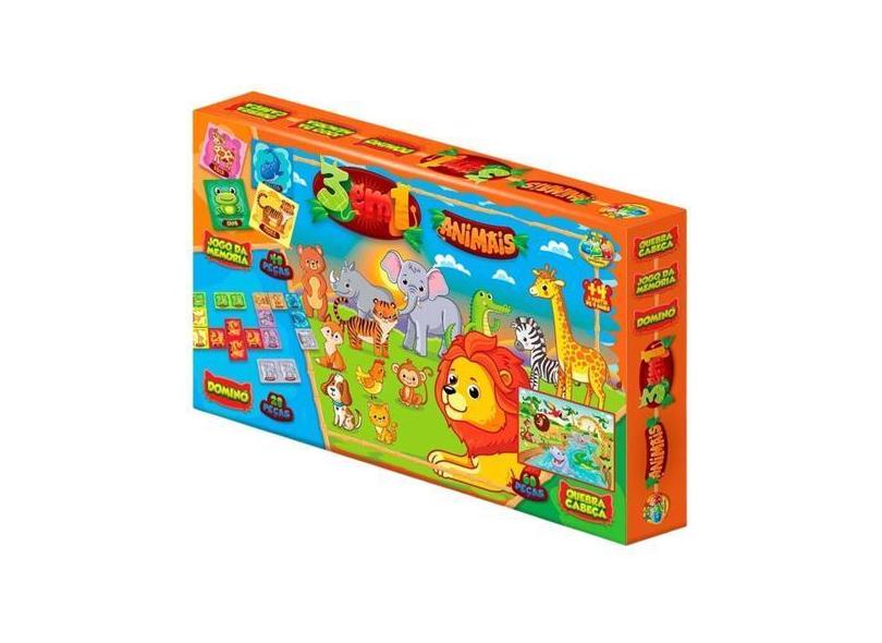 Jogos 3 Em 1 Animais - Dominó, Quebra Cabeça E Jogo Memória - Ggb