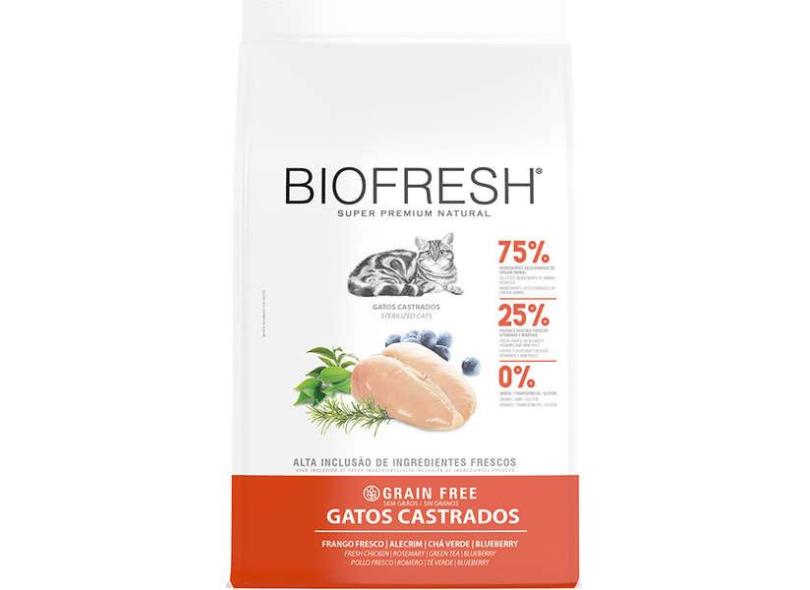 O menor preço encontrado no Brasil para Ração Seca Biofresh Frango Fresco, Alecrim, Chá Verde e Blueberry para Gatos Castrados - 400 g atualmente é R$ 43,90.
