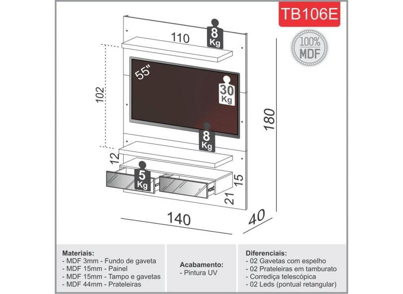 Painel TV 55" Suspenso 1,40m com Luzes Led e Espelhos 100% MDF TB106E Dalla Costa