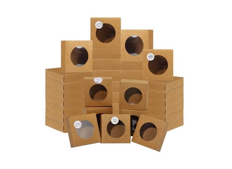 Liobelon 30 caixas de sabonete Kraft para sabonete caseiro 8 x 8 x 3 cm, caixas de embalagem de sabão com janelas transparentes, suprimentos vazios para fabricação de sabonete, mini caixa de presente