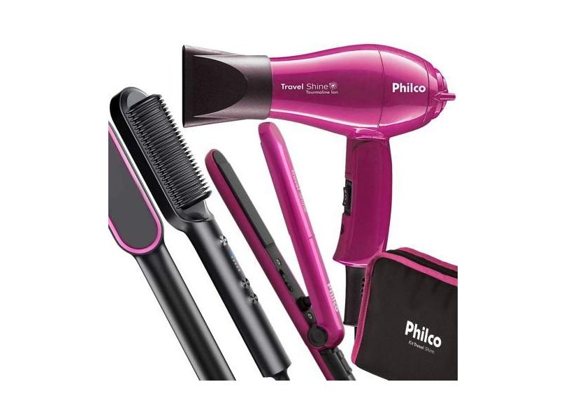 Kit Mini Secador De Cabelo Philco E Chapinha Pequeno Bivolt Com Bolsa