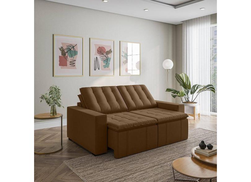 Sofá Cama Retrátil e Reclinável 3 Lugares 200cm em Linho com Molas e Braço Reto Palmeira Cabecasa Ma Marrom
