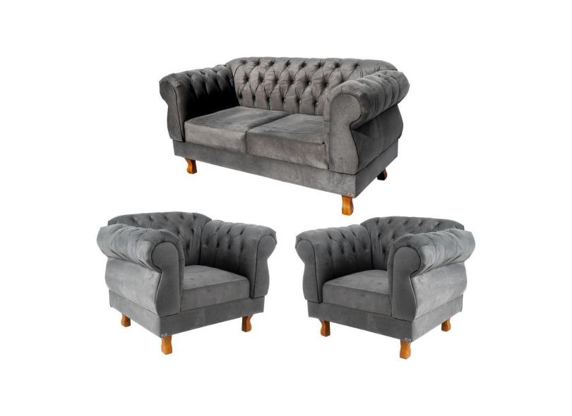 O menor preço encontrado no Brasil para 1 Sofá 2,30cm + 2 Poltronas Chesterfield Elisabeth Suede Cinza atualmente é R$ 3.599,00.
