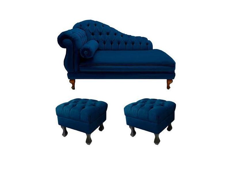 Divã Recamier Namoradeira Larissa 150cm + 2 Puffs Retrô Suede Azul Mar
