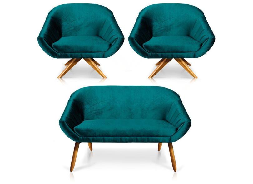 Kit 01 Namoradeira 02 Lugares E 02 Poltronas Giratória Giovana Acetinado Azul Base Madeira