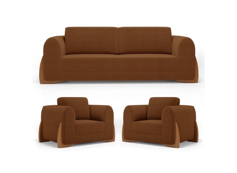 Kit 02 Poltronas e 01 Sofá Bloom 180cm 02 Lugares com Pés de Madeira Bouclê Terracota - Desk Design