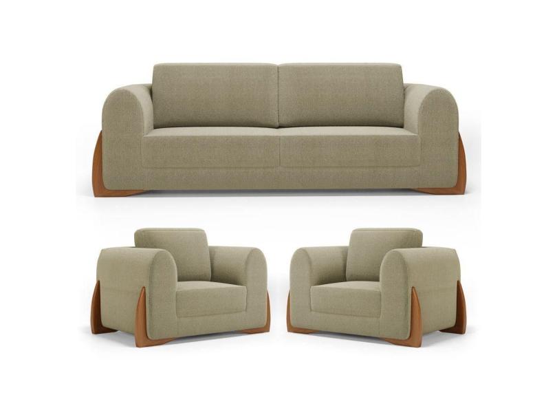Kit 02 Poltronas E 01 Sofá Bloom 200cm 03 Lugares Com Pés De Madeira Bouclê Bege - Desk Design