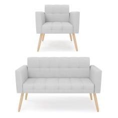 Kit 1 Sofá Namoradeira E 1 Poltrona Elisa Linho Cinza A05 Pés Palito Natural - D`rossi